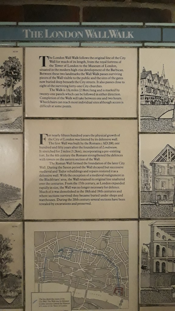 There are large sections in the Barbican and down Noble Street where Shakespeare lived for a short period (see Shakespeare in London). I wonder if he ever thought of the Romans when walking past the wall – probably not. Sometimes, it is the Roman wall you see, sometimes it is the medieval, Victorian or a mixture of many periods.
