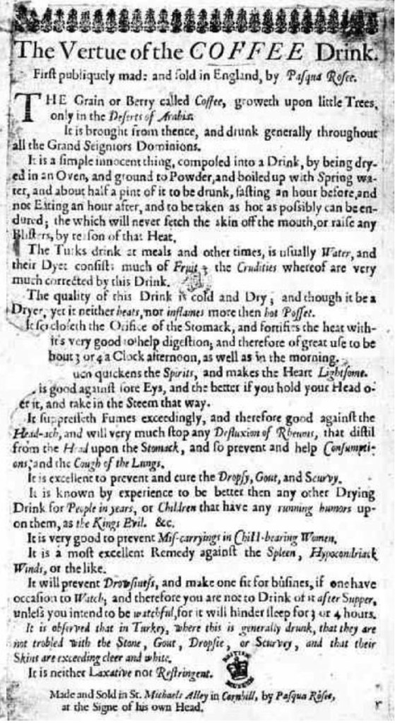 What was this new drink like? A handbill of the time, printed around 1652, describes the drink for those unfamiliar with coffee. The handbill promoted it in a very positive light, discussing its background, how it is prepared and the health benefits. There is a description, “the quality of this Drink is cold and Dry; and though it be a Dryer, yet it neither heats, nor inflames more than hot Posset.” A translation of the handbill is below.