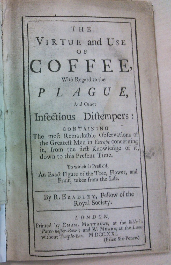 There are various reports of coffee being good and bad for you. In 1721, R. Bradley, Fellow of the Royal Society wrote a pamphlet, The Virtue and Use of COFFEE With Regard to the PLAGUE and other Infections and Distempers.